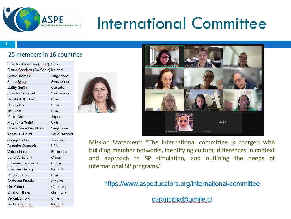 International CommitteeMission Statement:The international committee is charged with building member networks, identifying cultural differences in context and approach to SP simulation, and outlining the needs of international SP programs. Projects of this year:1.) Members of the Committee are participating in two research projects: - A qualitative study on how the ASPE standards are being implemented around the world, led by the International Member Liaison, Beate Brem. 2.) This committee facilitates the process for translations of the ASPE Standards of Best Practice into languages other than English. For current translations in Japanese, French, Chinese and Spanish see: https://aspehq.memberclicks.net/sobp-translations - If you are interested in translating the ASPE SOBP please contact the Committee Chair, Cathy Smith at [email protected] 3.) Presentations at various conferences, including the ASPE annual conference, and webinars. In addition, in 2021, we are presenting at the Japanese Medical Conference. International committee members presented “Challenges of Working with Faculty—Perspectives from around the World” at Kansas City conference 2018. International Committee Members:Chair (2024-2025) Co-Chair (2024-2025) Committee members
